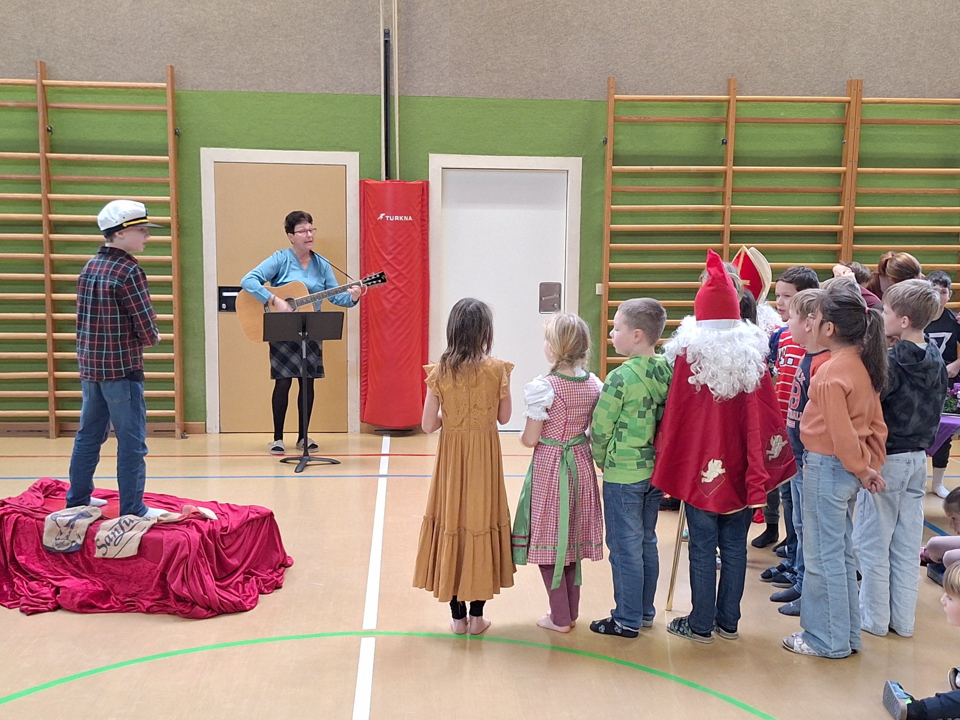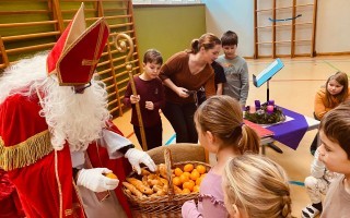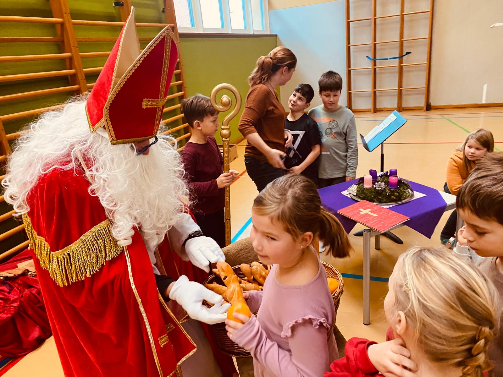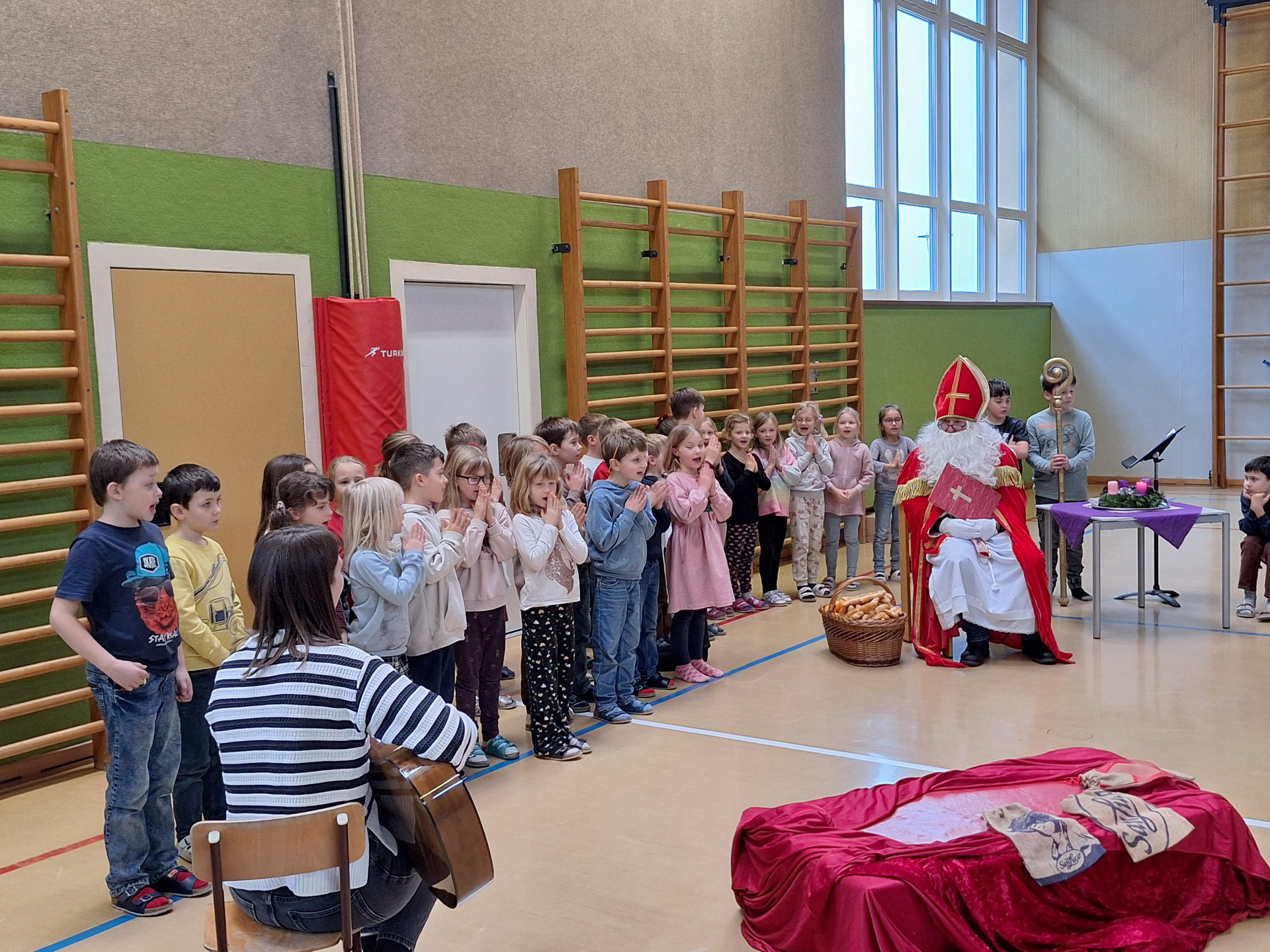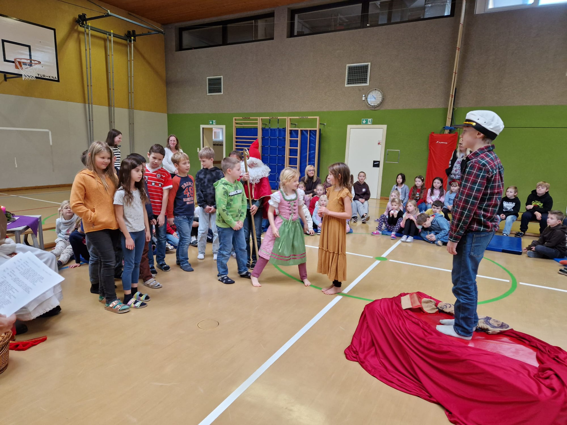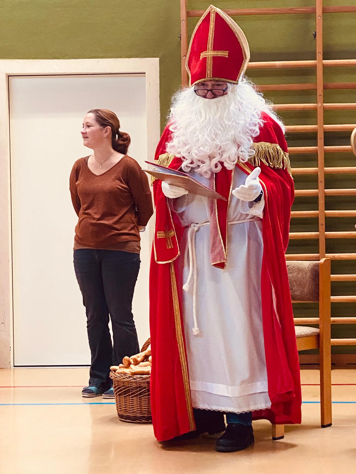 Nach einem bunten Reigen von Gedichten, szenischen Spielen und Liedern richtete unser Nikolaus sehr lobende, stärkende und aufbauende Worte an die Kinder.
