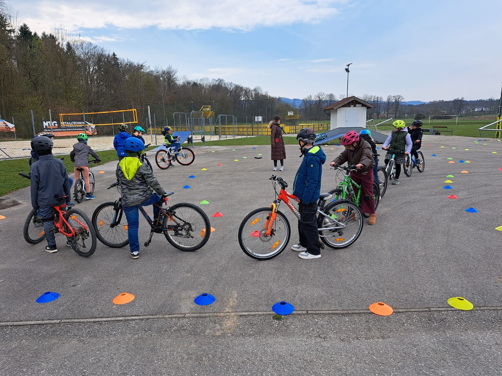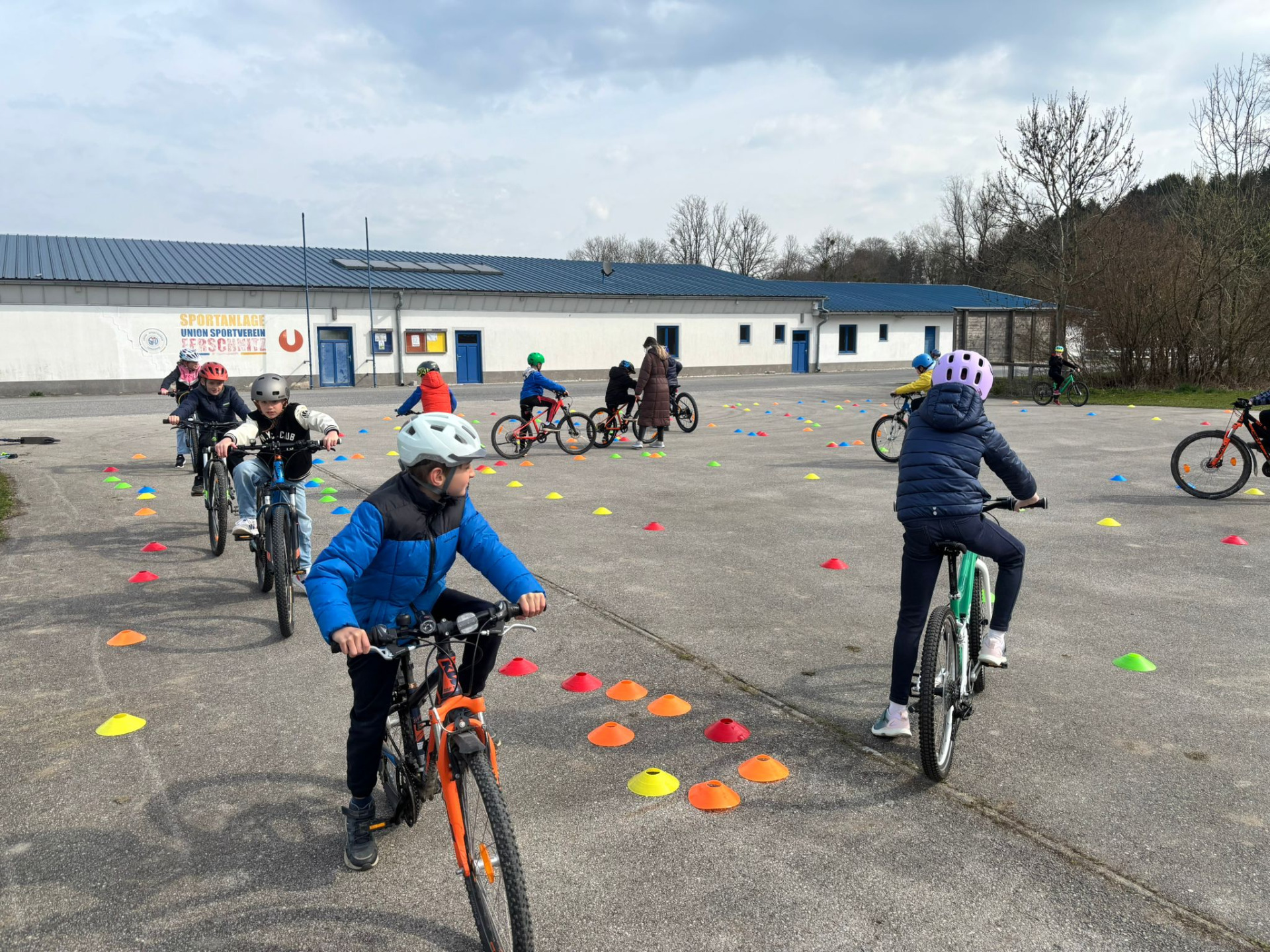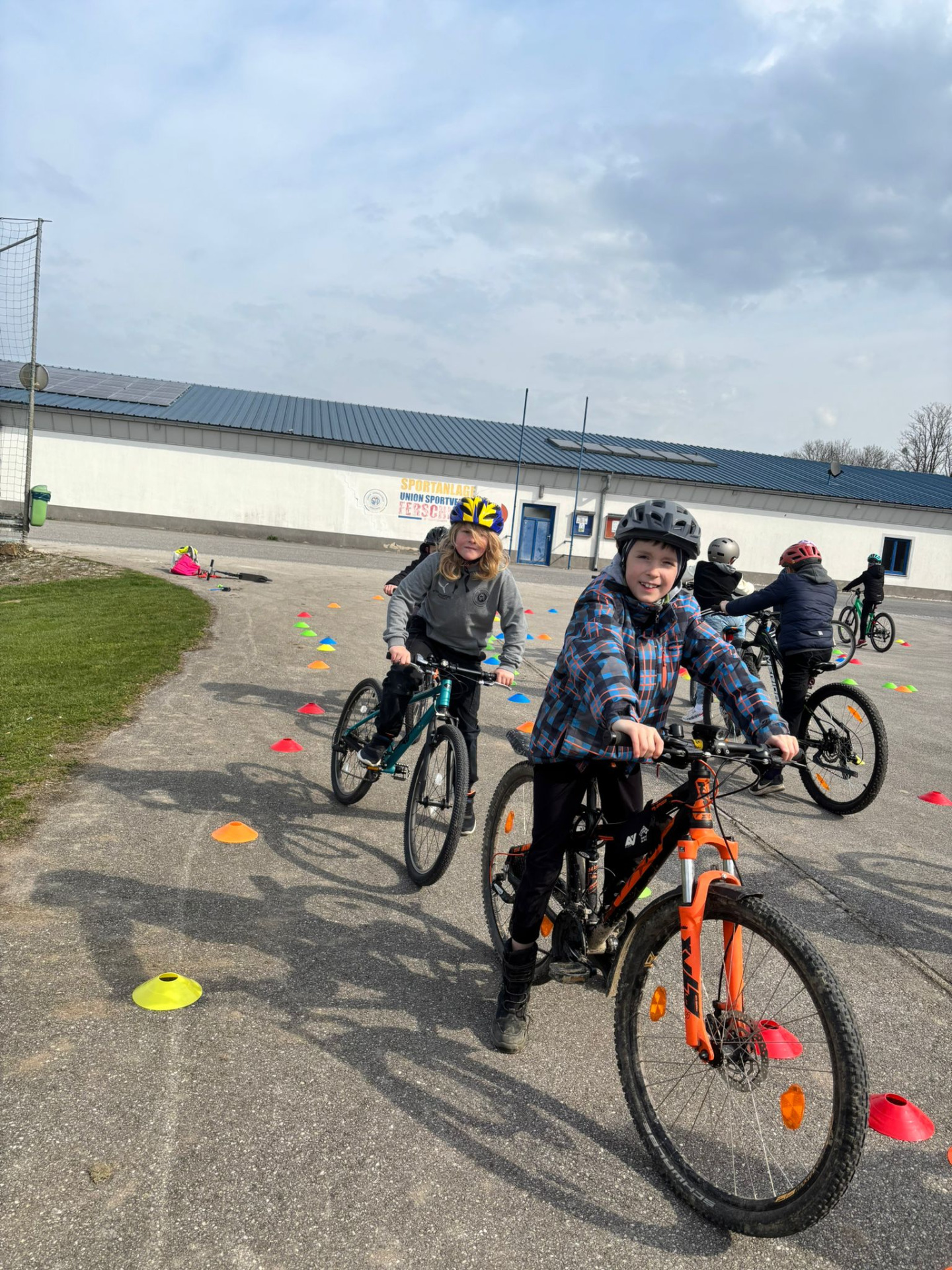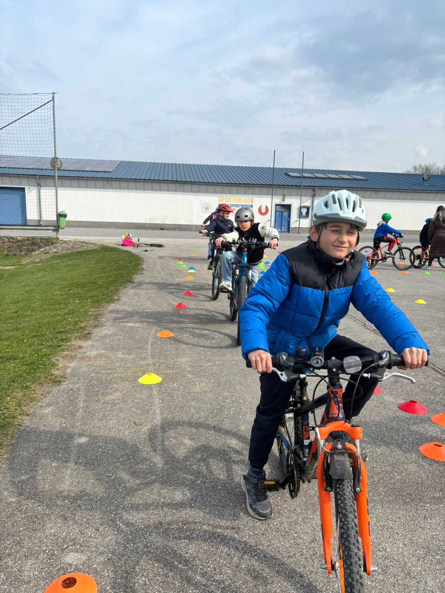 Für die dritten Klassen wurde ein Radfahrparcours am Parkplatz des Sportplatzes aufgebaut, auf dem die Kinder trainieren durften.