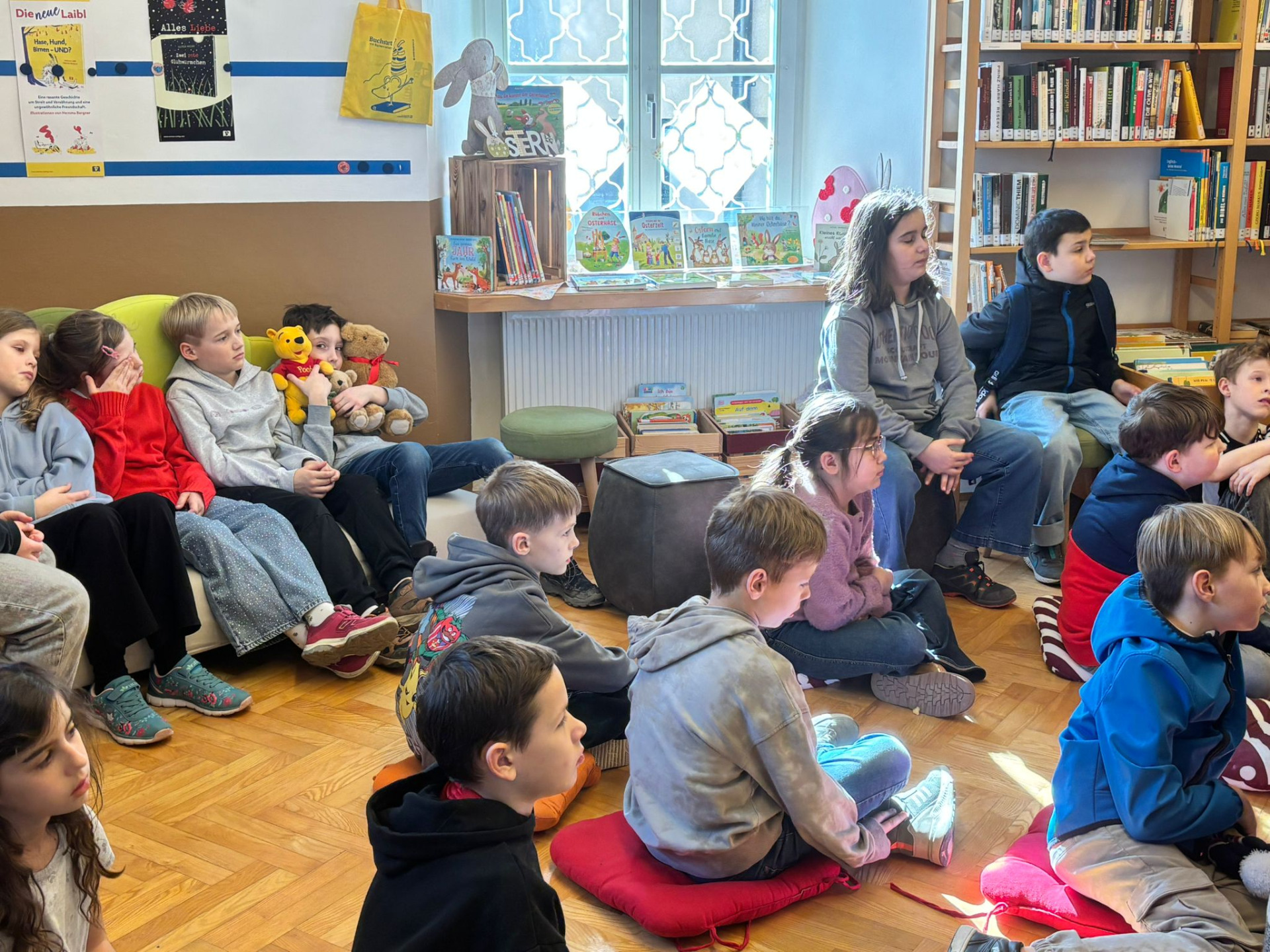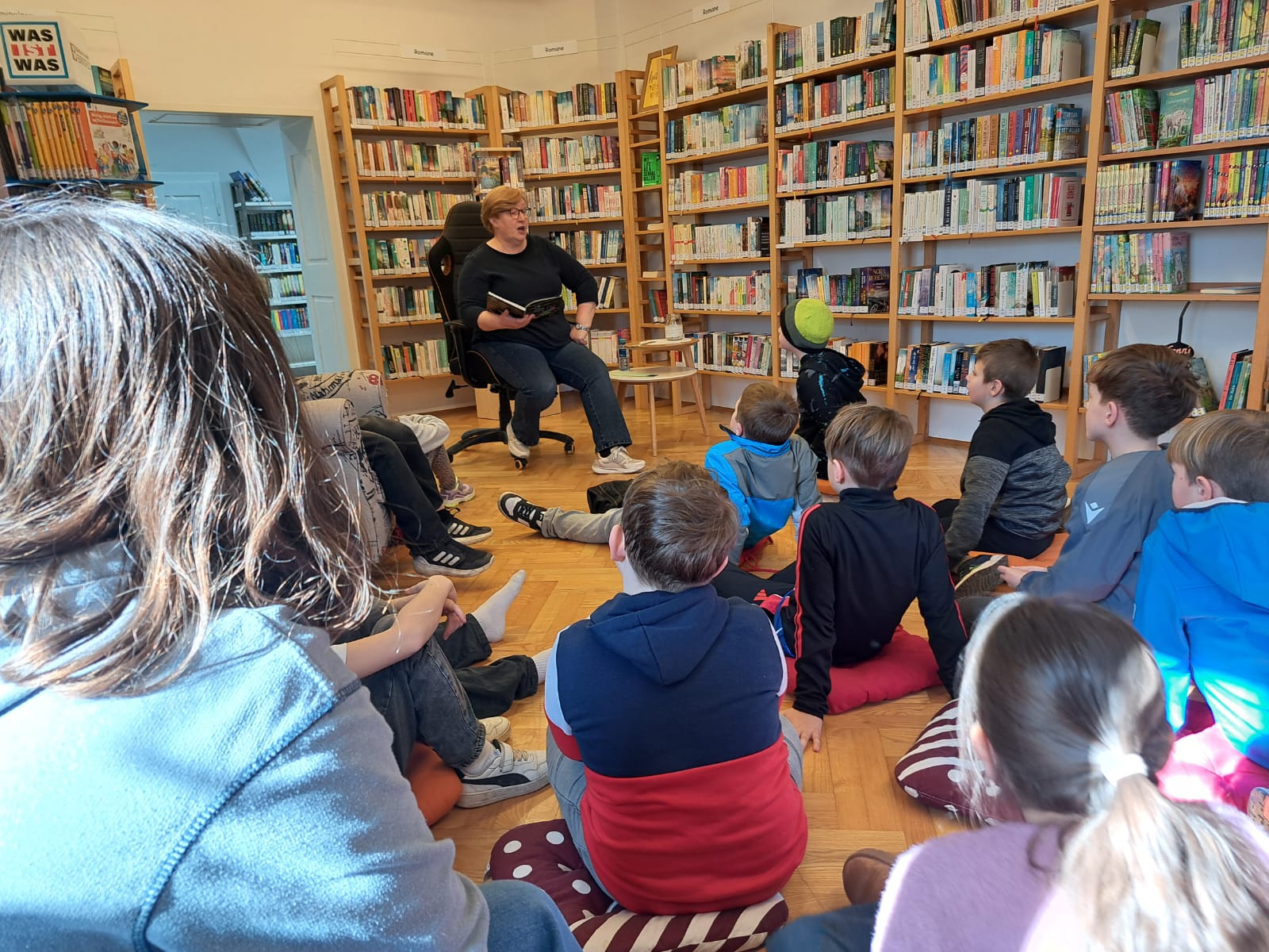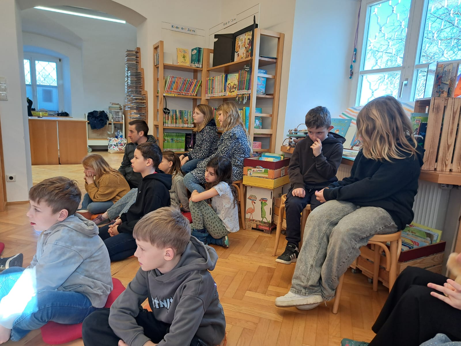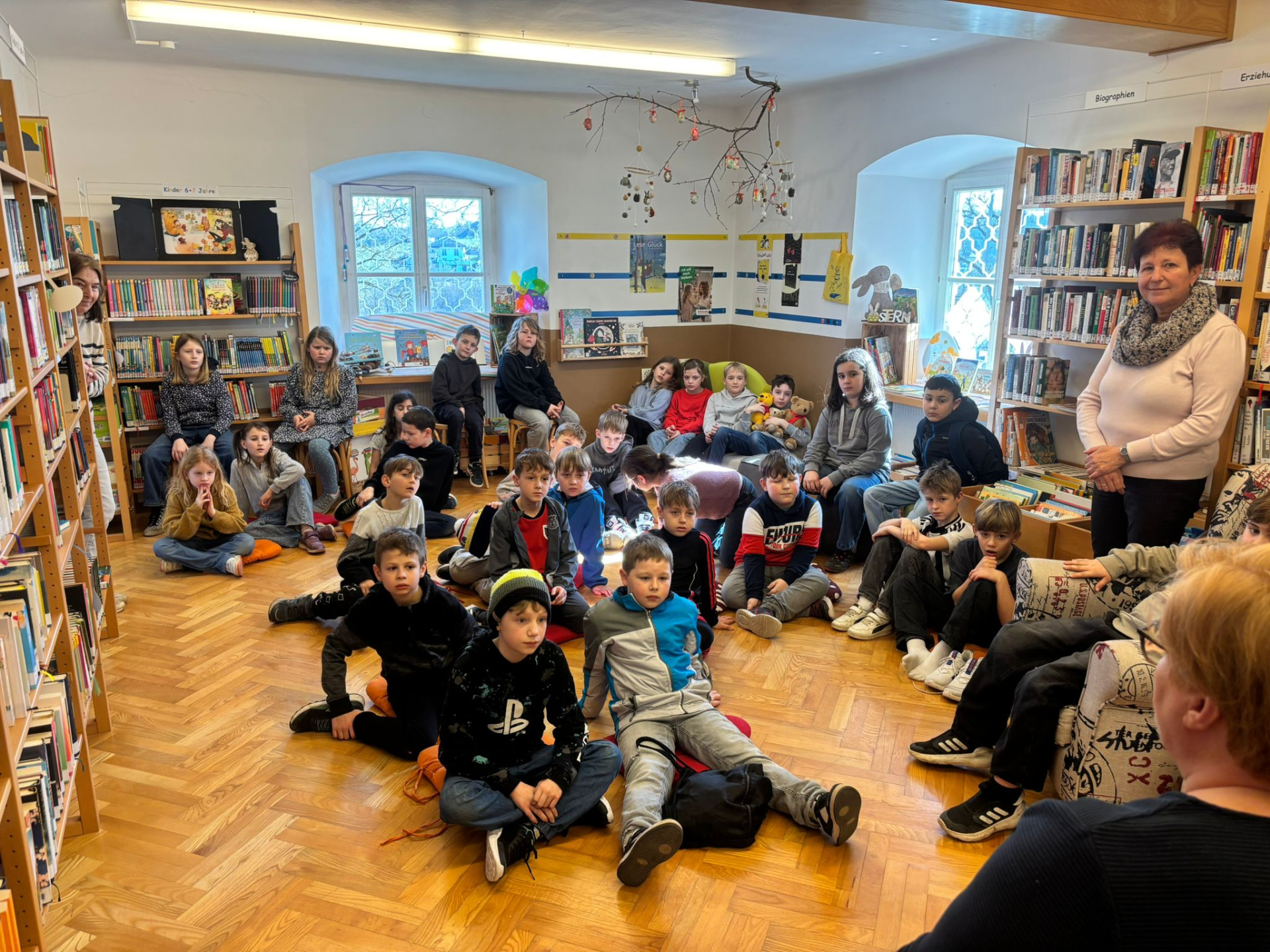 Die dritten Klassen verbanden diesen interessanten Besuch gleich mit einer Lesung in der Pfarr- und Gemeindebücherei, wo sie von Büchereimitarbeiterin Annemarie Halbmayr sehr herzlich begrüßt wurden.