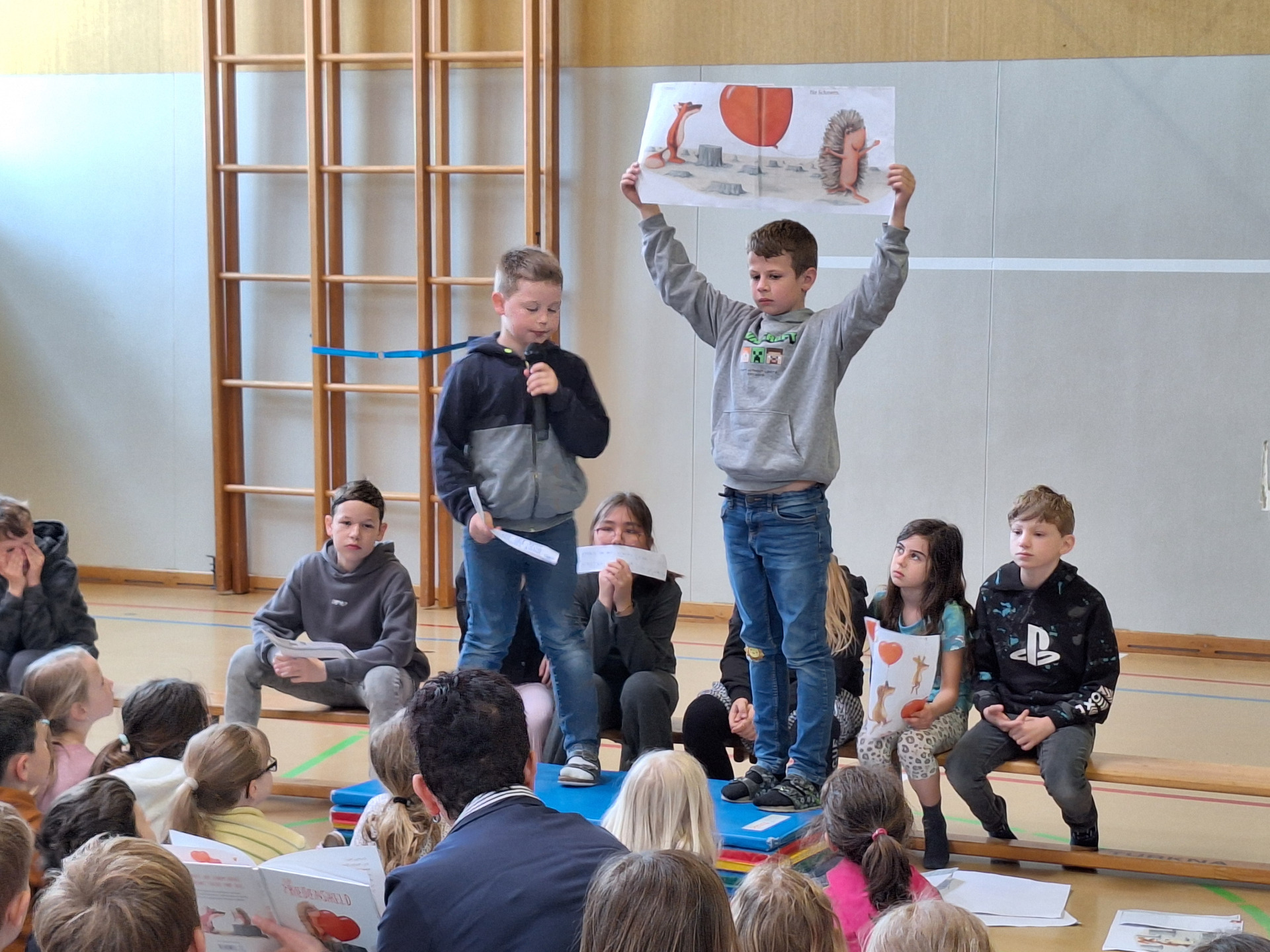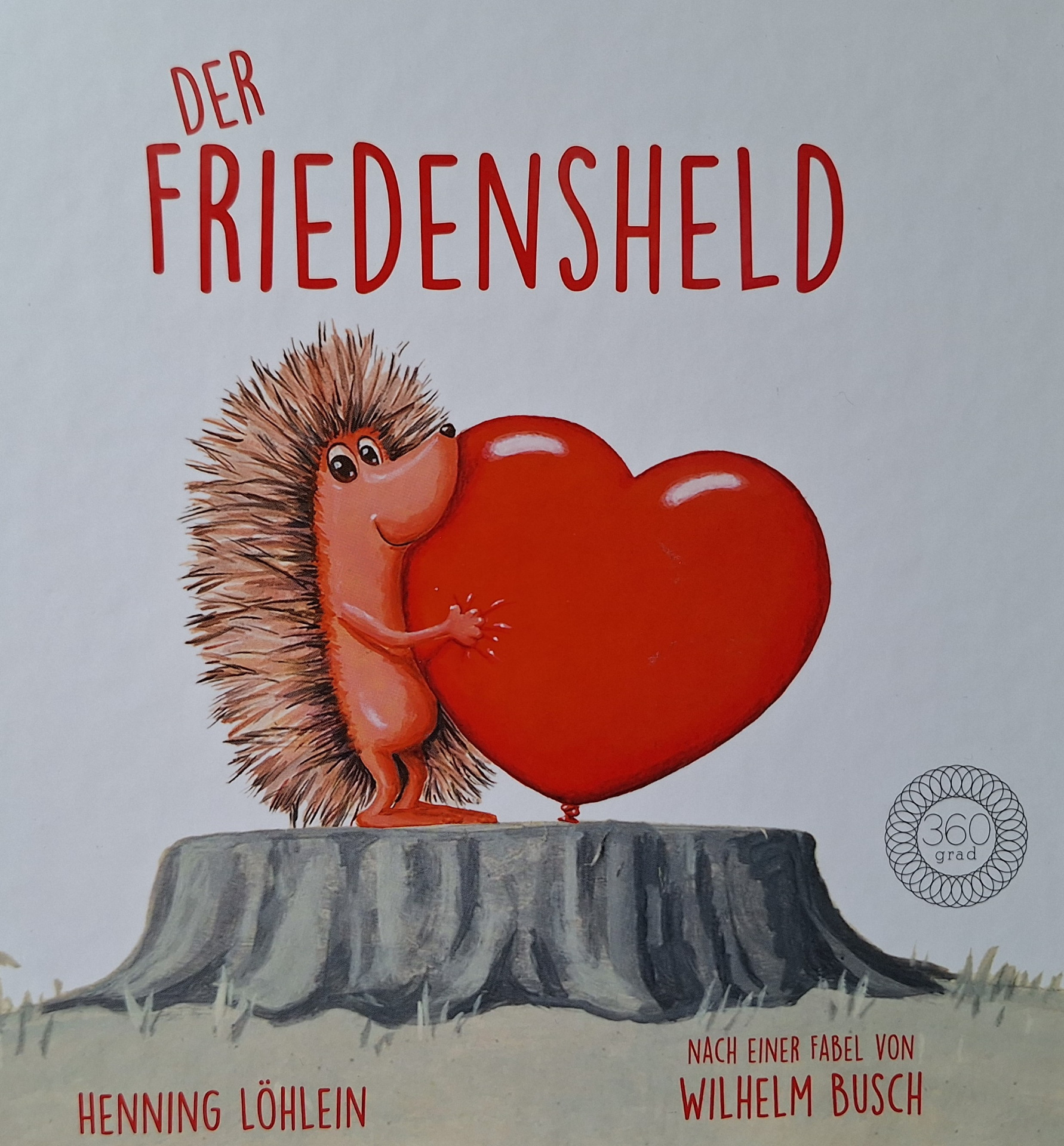 Das Bilderbuch "Der Friedensheld" wurde mit verteilten Abschnitten vorgelesen und den Kindern auch mit großen Bildern präsentiert.