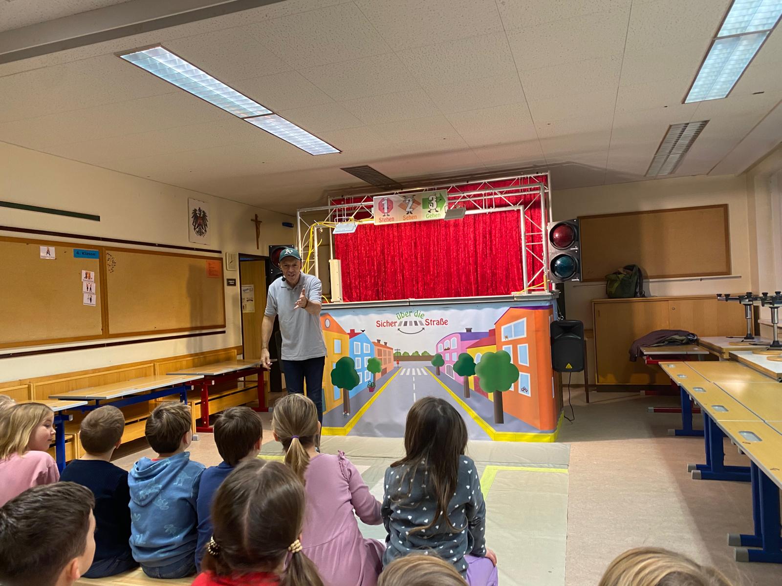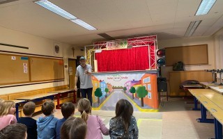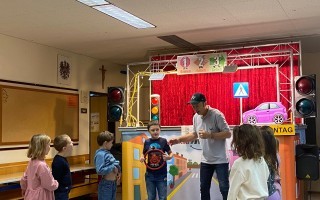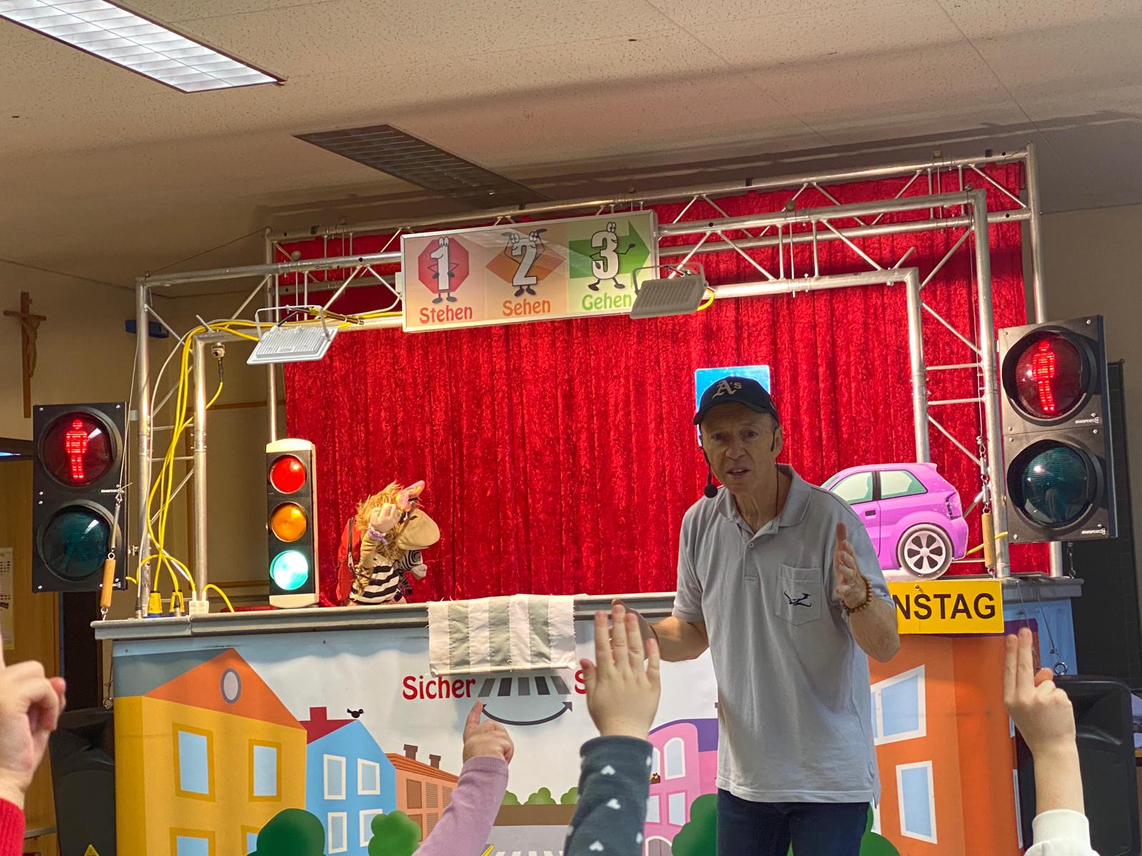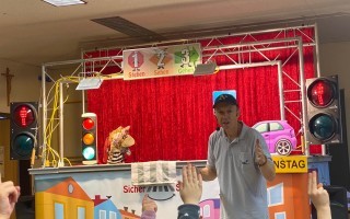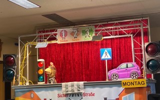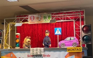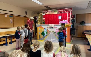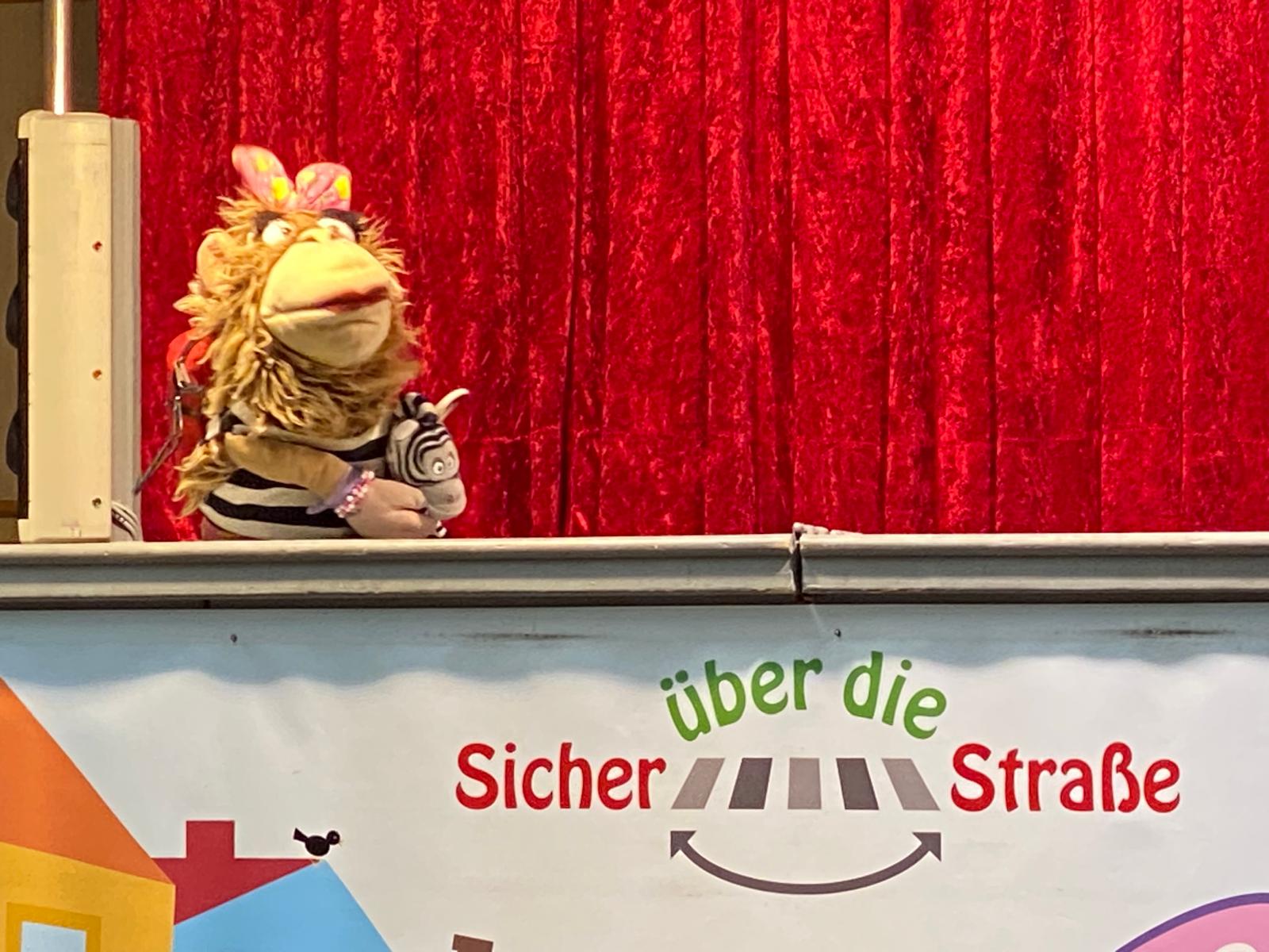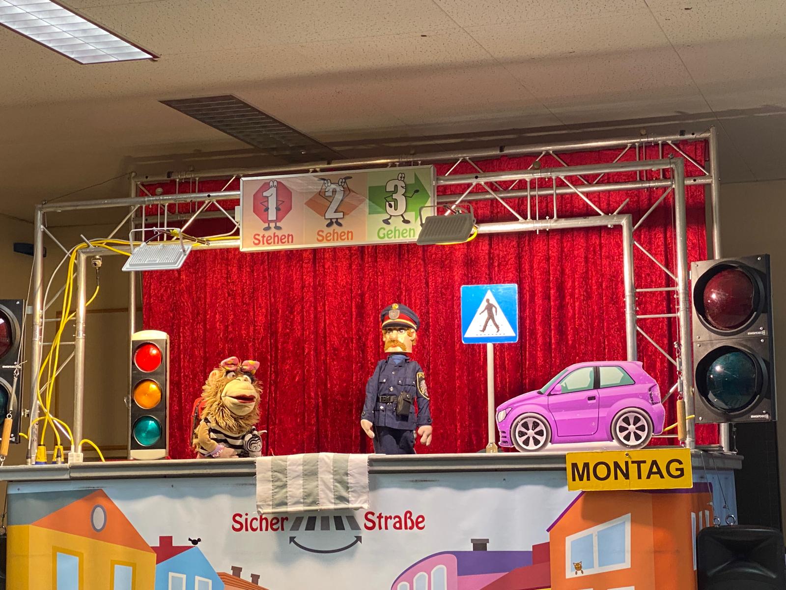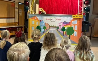 Die Kinder der 1. und 2. Klassen besuchten das Verkehrstheater „Puppomobil“ . Sie begleiteten das Äffchen Antonia auf ihrem Schulweg.