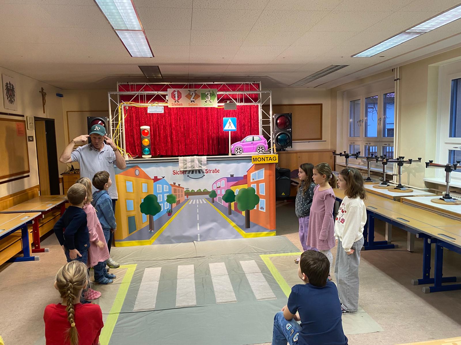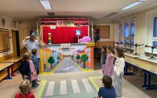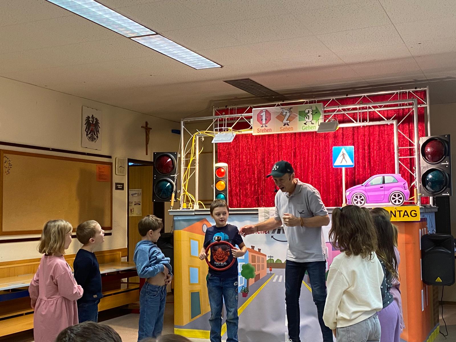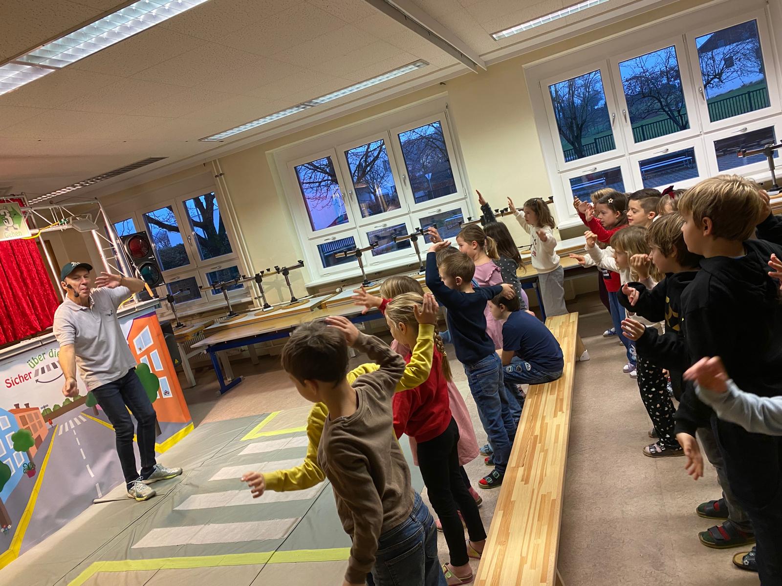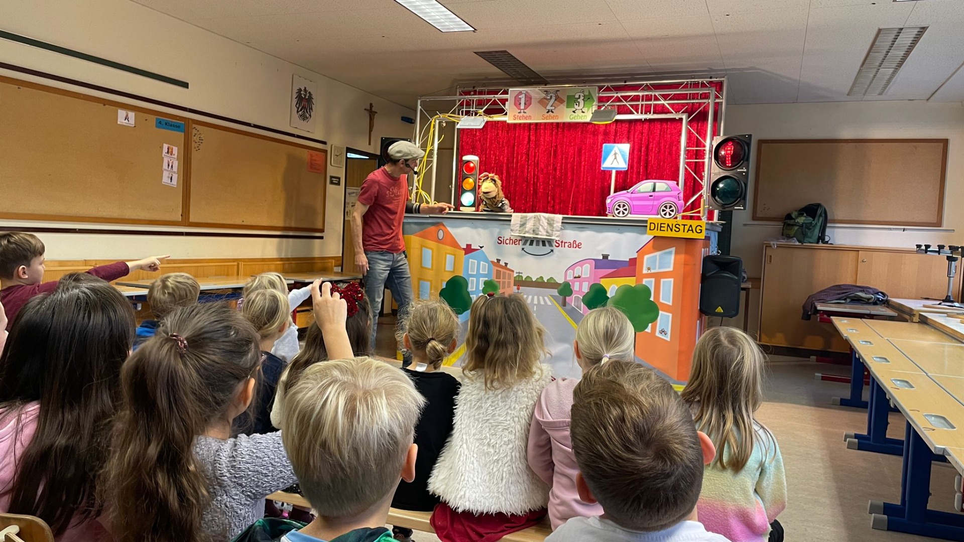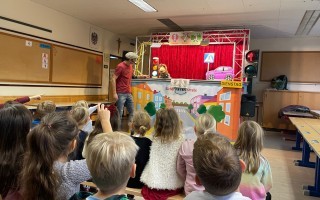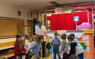 Die Kinder der 1. und 2. Klassen besuchten das Verkehrstheater „Puppomobil“ . Sie begleiteten das Äffchen Antonia auf ihrem Schulweg.