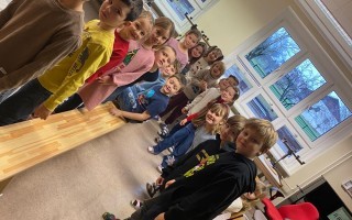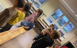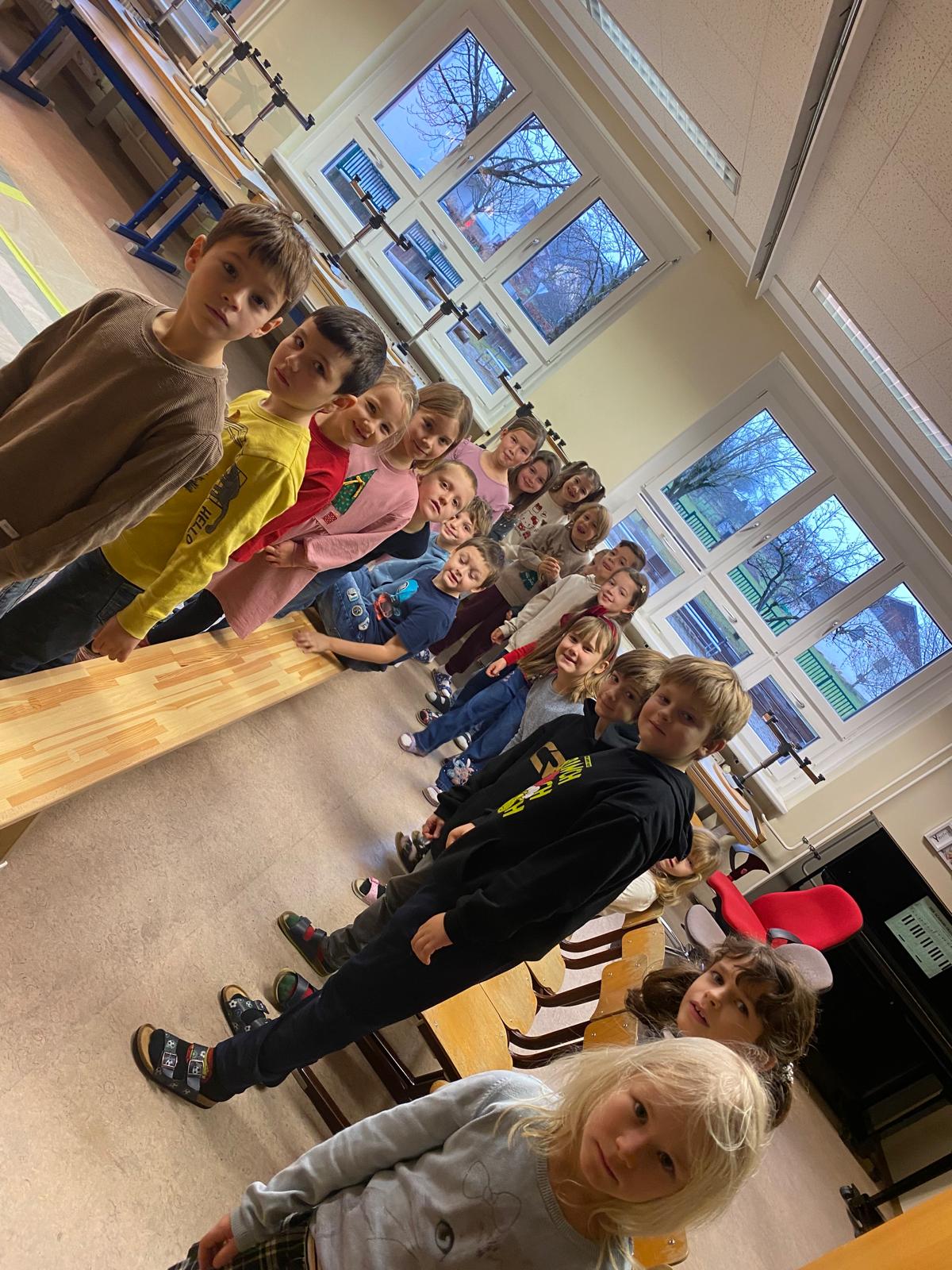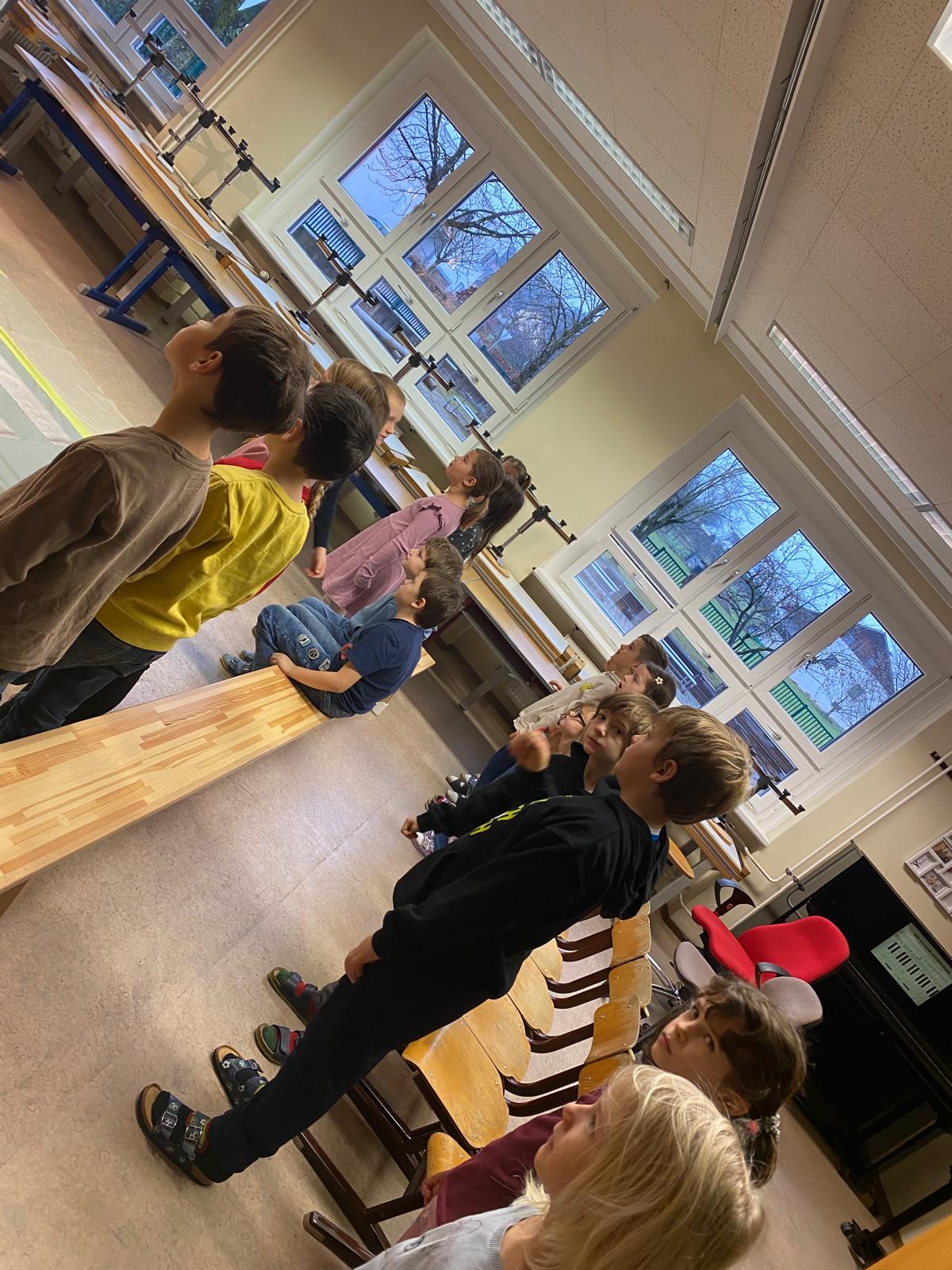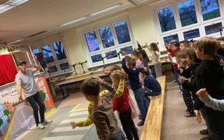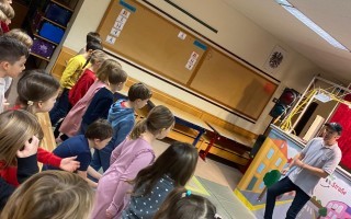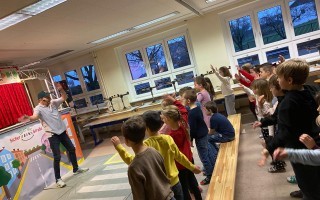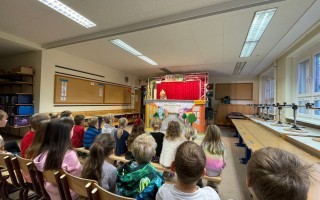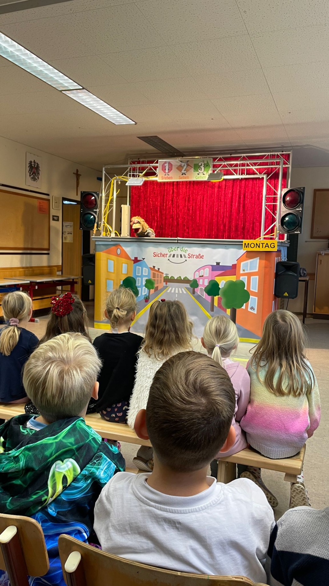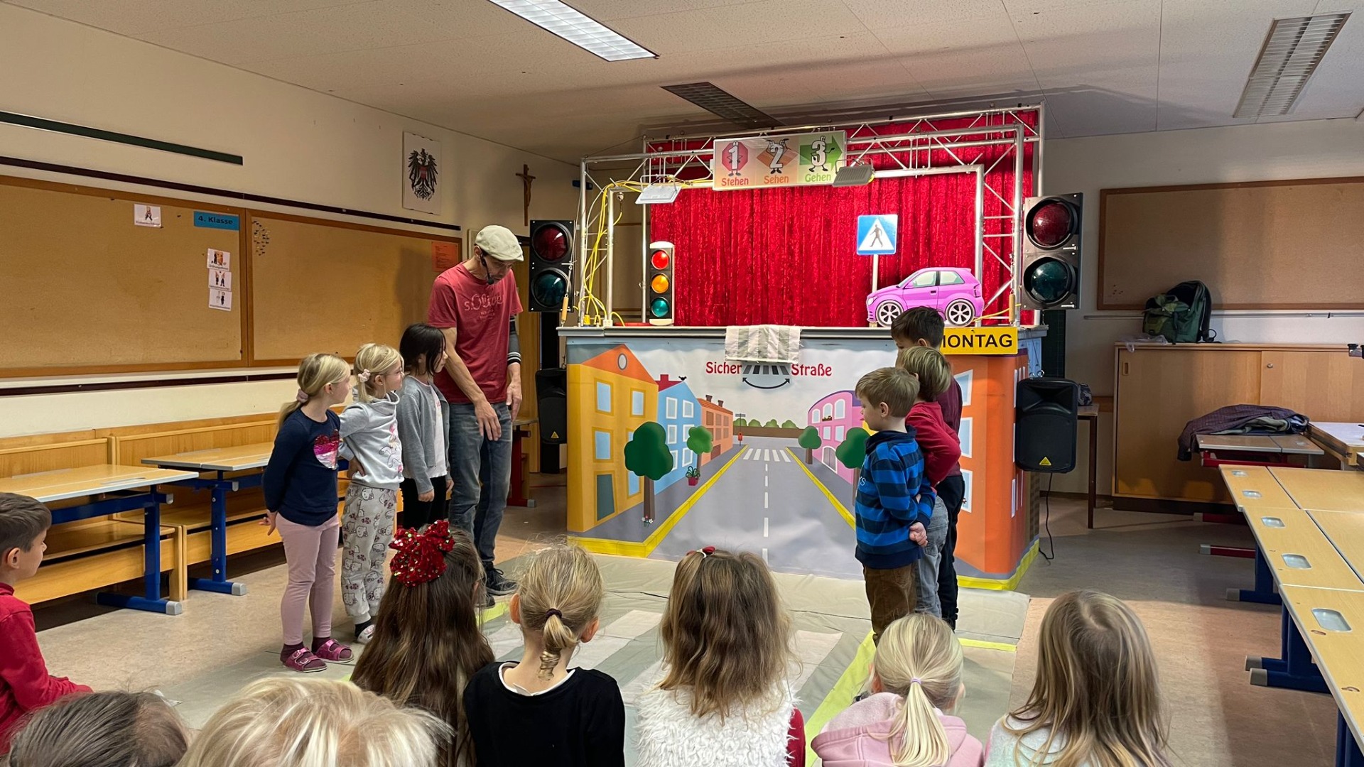 Die Kinder der 1. und 2. Klassen besuchten das Verkehrstheater „Puppomobil“ . Sie begleiteten das Äffchen Antonia auf ihrem Schulweg.