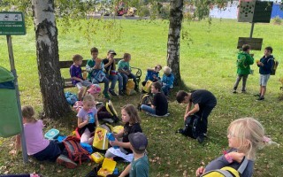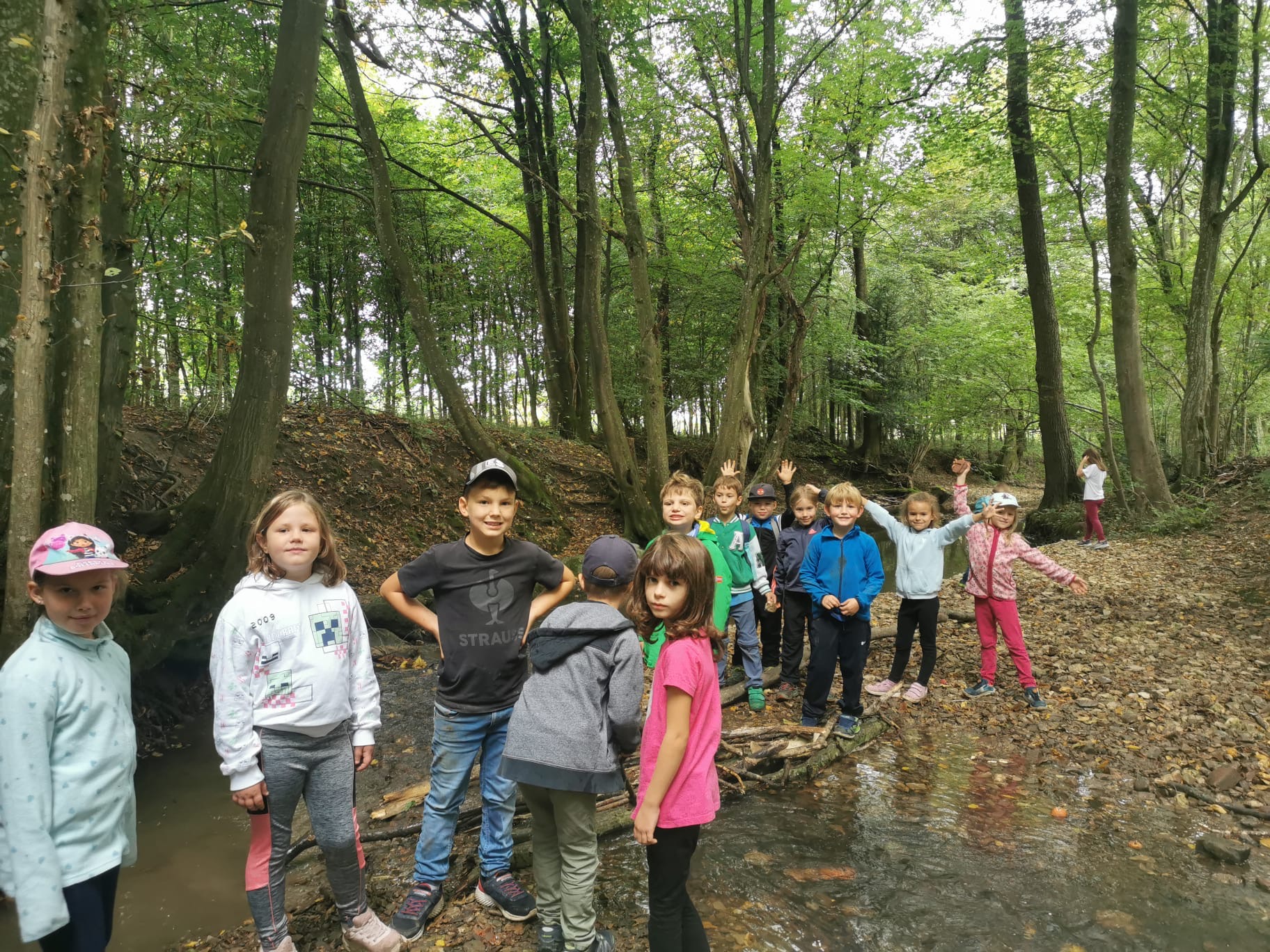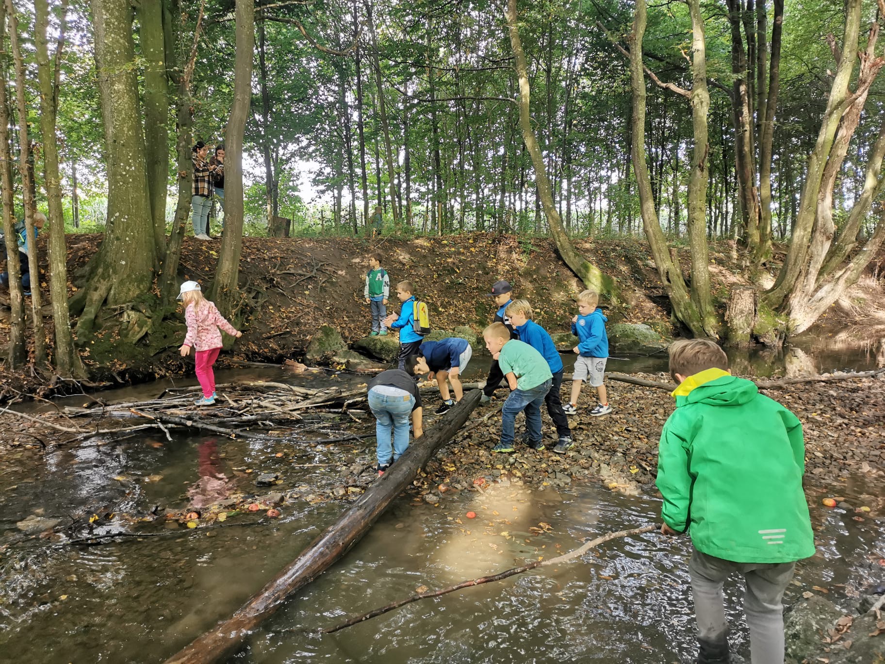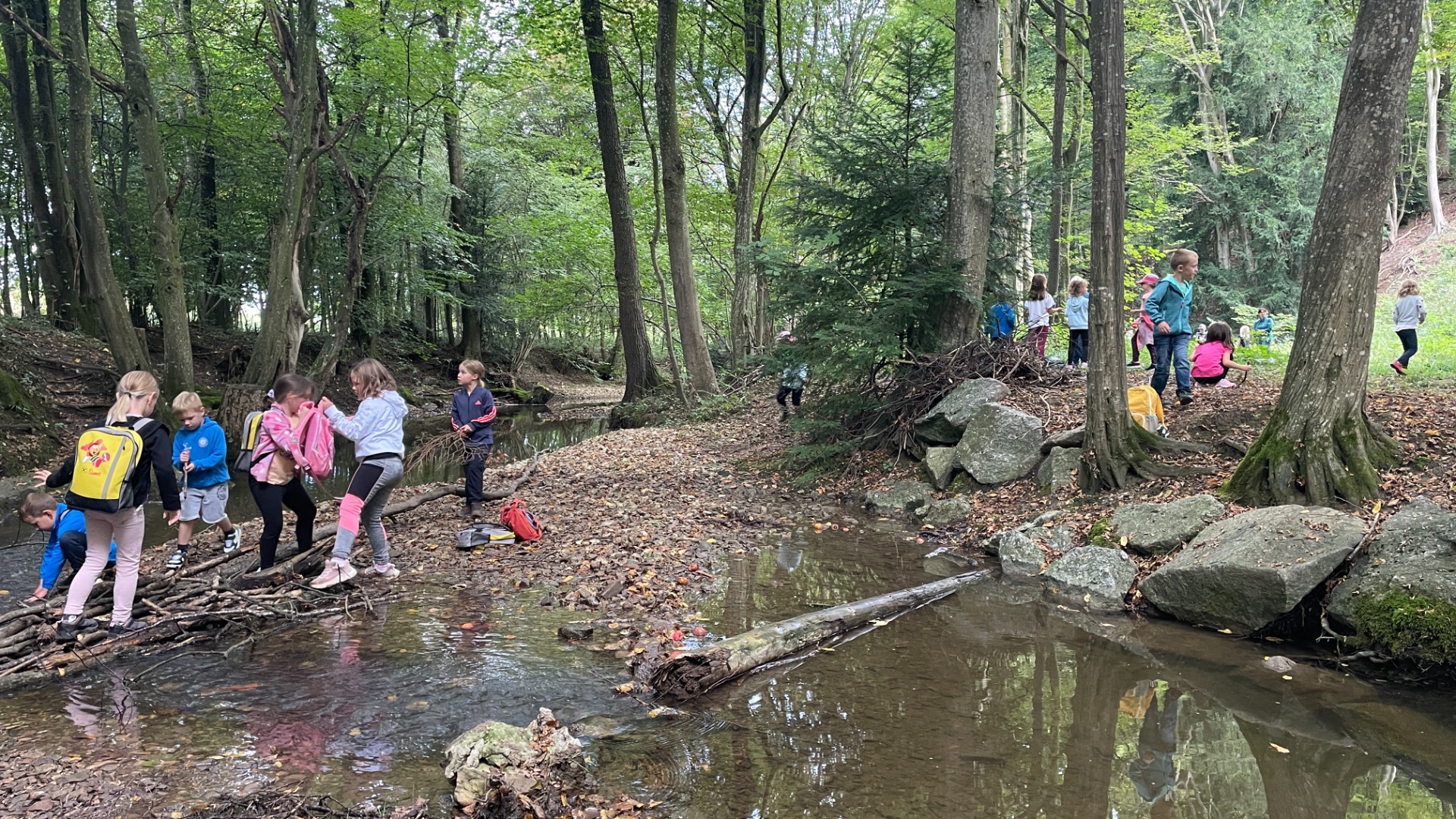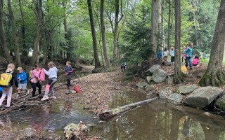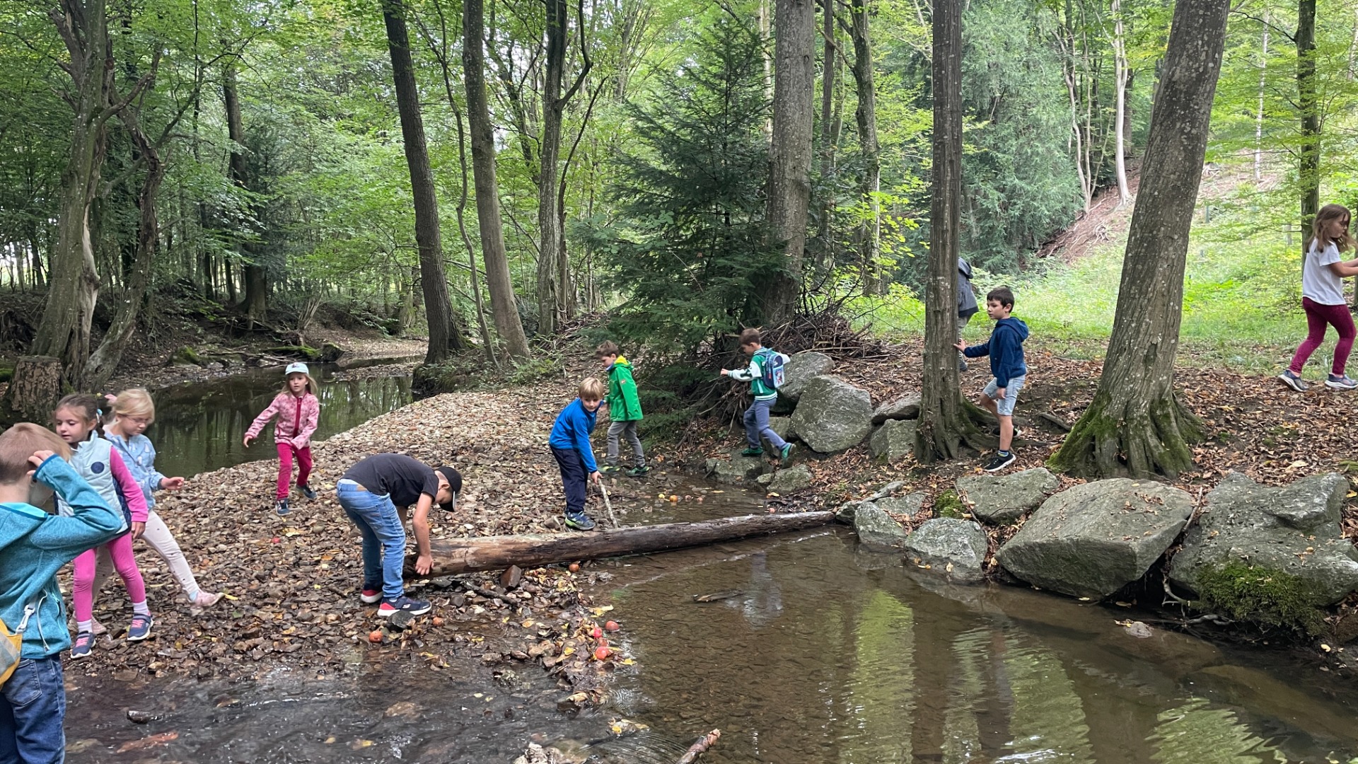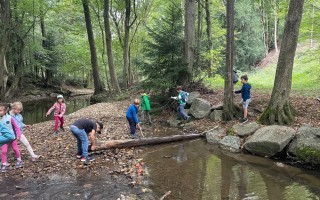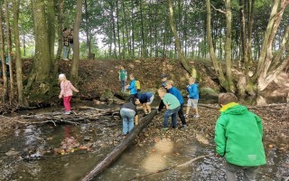 Ein besonderes Highlight war der Stopp am Bach: Dort konnten die Kinder nach Herzenslust spielen, entdecken und kleine Bauwerke errichten. Die Freude war groß, und schnell entstanden kreative Ideen im und rund um das Wasser.