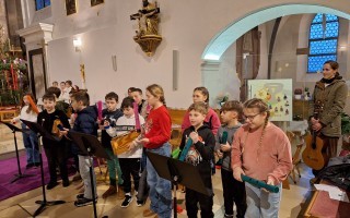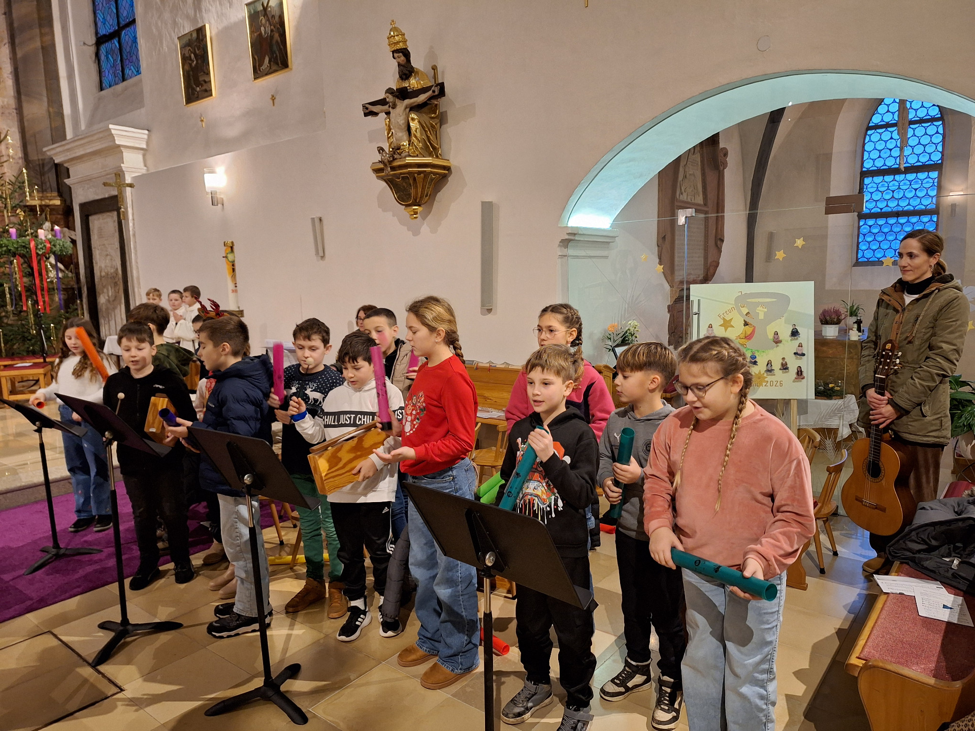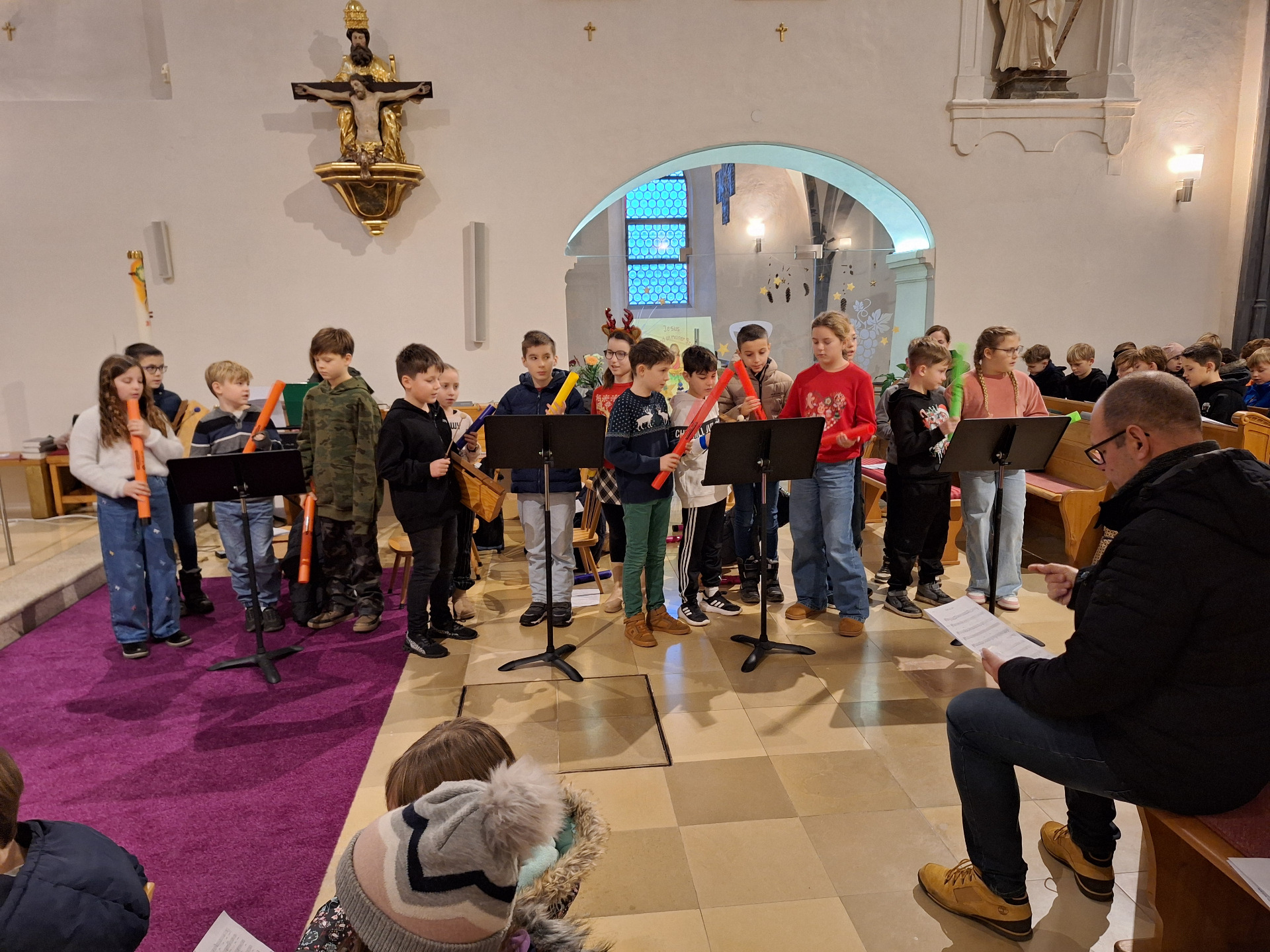 Die Kinder der 4. Klasse umrahmten einige Lieder mit den Boomwhackers und sangen kräftig mit.